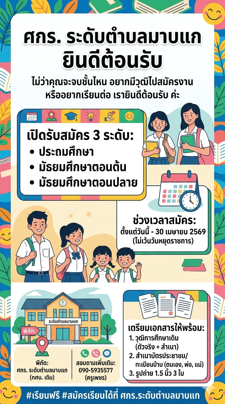 รับสมัครนักศึกษาใหม่ ภาคเรียน 1/2569 ครู ศกร.ตำบล ข่าวกิจกรรม ศกร.ตำบล เผยแพร่เมื่อ: 25 มีนาคม 2569 จำนวนการเข้าชม: 3